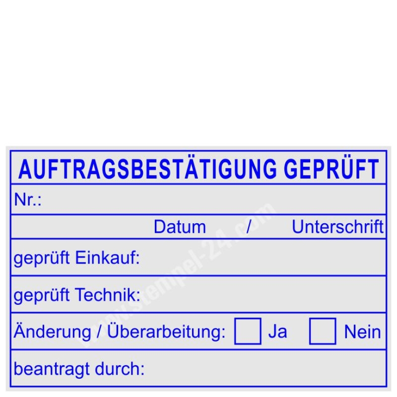 Textplatte: Auftragsbestätigung geprüft, Nummer, geprüft Einkauf Datum Unterschrift, geprüft Technik, Änderung / Überarbeitung Ja / Nein, beantragt durch.