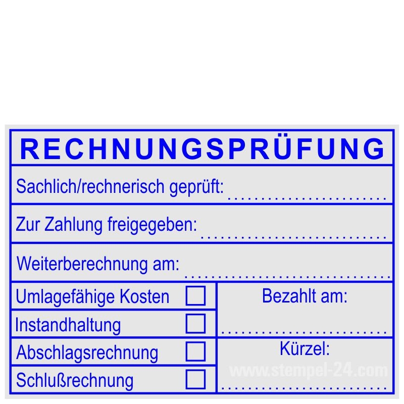 Textplatte: Rechnungsprüfung, Sachlich/rechnerisch geprüft, zur Zahlung freigegeben, Weiterberechnung an, Umlagefähige Kosten, Instandhaltung, Abschlagsrechnung, Schlußrechnung, Bezahlt am, Kürzel.