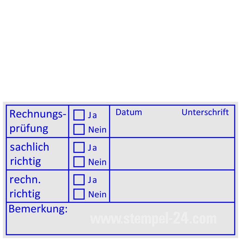 Textplatte: Rechnungsprüfung, sachlich richtig, rechnerisch richtig, Ja/Nein, Datum, Unterschrift, Bemerkung.