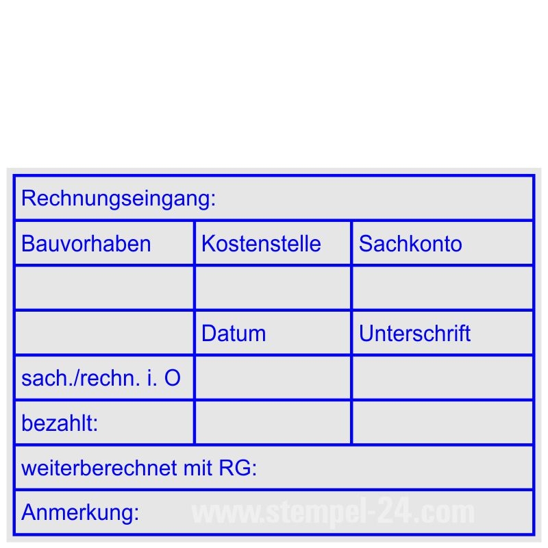 Textplatte: Rechnungseingang, Bauvorhaben, Kostenstelle, Sachkonto, Datum, Unterschrift, sach./rechn. i.O., bezahlt, weiterberechnung mit RG., Anmerkungen.