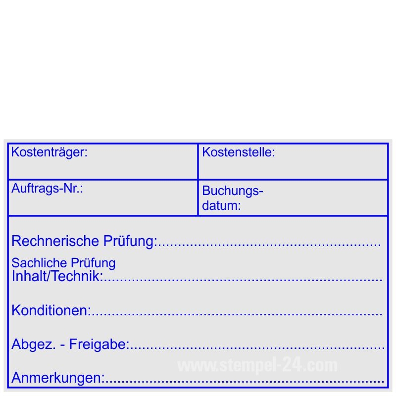 Textplatte: Kostenträger, Kostenstelle, Auftrags-Nummer, Buchungsdatum, Rechnerische Prüfung, Sachliche Prüfung, Konditionen, Abgezeichnet-Freigabe, Anmerkungen