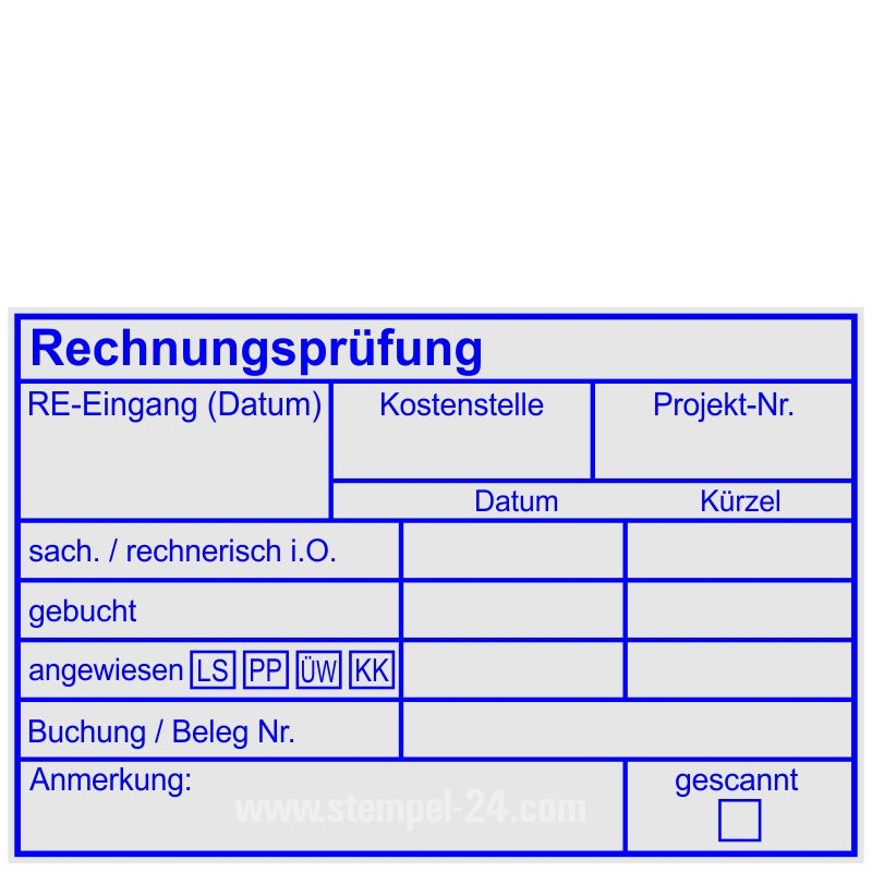 Textplatte: Rechnungsprüfung, RE-Eingang, Kostenstelle, Projekt-Nr., Datum, Kürzel, sach./rechnerisch i.O., gebucht, angewiesen (Lastschrift, PayPal, Überweisung, Kreditkarte), Buchung/Belegnummer, Anmerkung, gescannt.