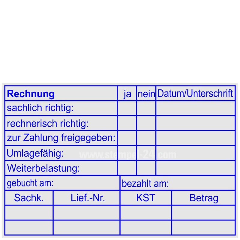Textplatte: Rechnung, sachlich richtig, rechnerisch richtig, zur Zahlung freigegeben, Umlagefähig, Weiterbelastung, gebucht am, bezahlt am, Sachk., Lief.-Nr., KST, Betrag, Datum, Unterschrift.