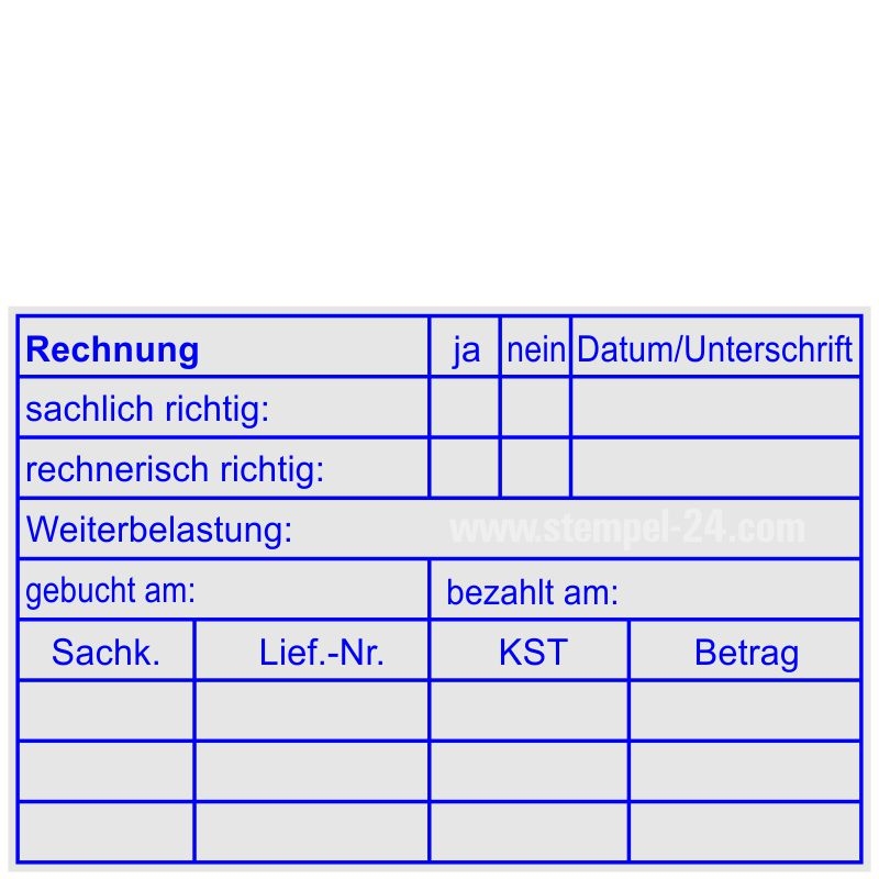 Textplatte: Rechnung, sachlich richtig, rechnerisch richtig, Weiterbelastung, gebucht am, bezahlt am, Sachkonto, Lief.-Nr., KST, Betrag, ja, nein, Unterschrift.