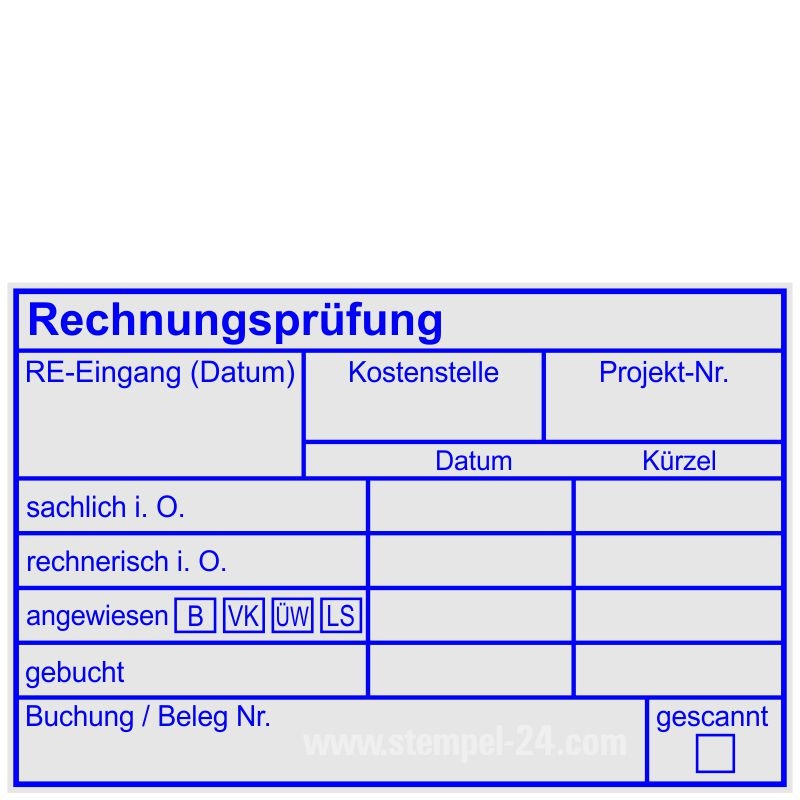 Textplatte: Rechnungsprüfung, RE-Eingang, Kostenstelle, Projekt-Nr., Datum, Kürzel, sachlich i.O., rechnerisch i.O., angewiesen (Bank, Vorkasse, Überweisung, Lastschrift), gebucht, Buchung/Belegnummer, gescannt.