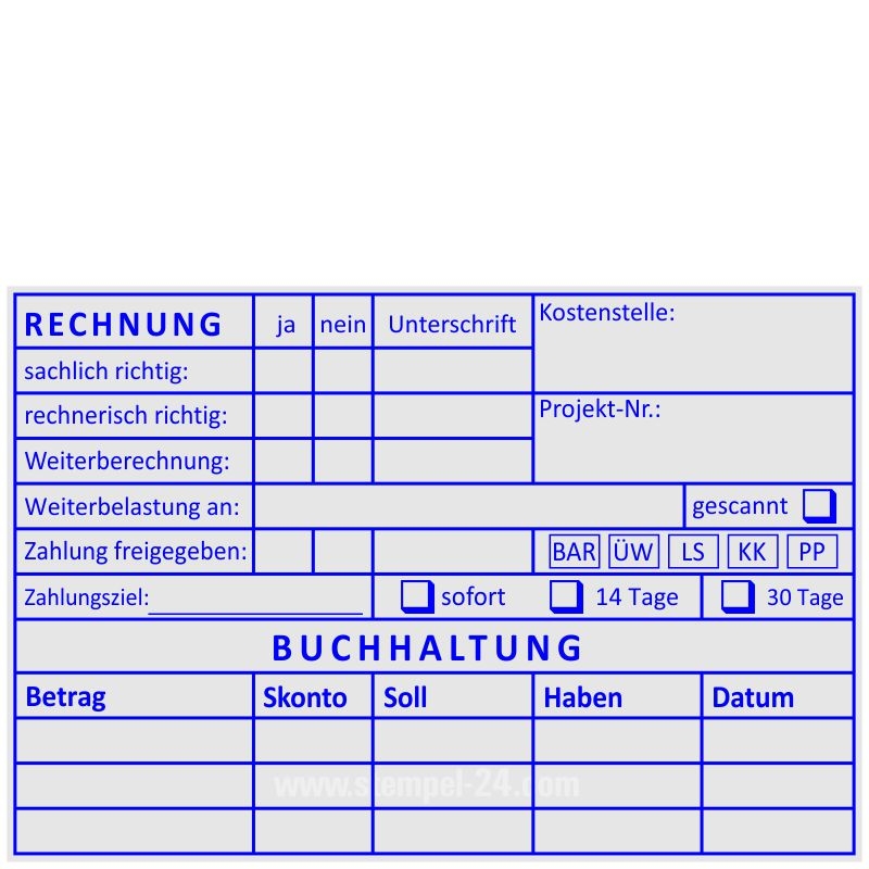 Textplatte: Rechnung, sachlich richtig ja/nein Unterschrift, rechnerisch richtig ja/nein Unterschrift, Weiterberechnung ja/nein Unterschrift, Weiterbelastung an, Zahlung freigegeben ja/nein Unterschrift, Zahlungsziel _______ -sofort - 14 Tage - 30 Tage, Kostenstelle, Projekt-Nr., gescannt, Buchhaltung, Betrag, Skonto, Soll, Haben, Datum.