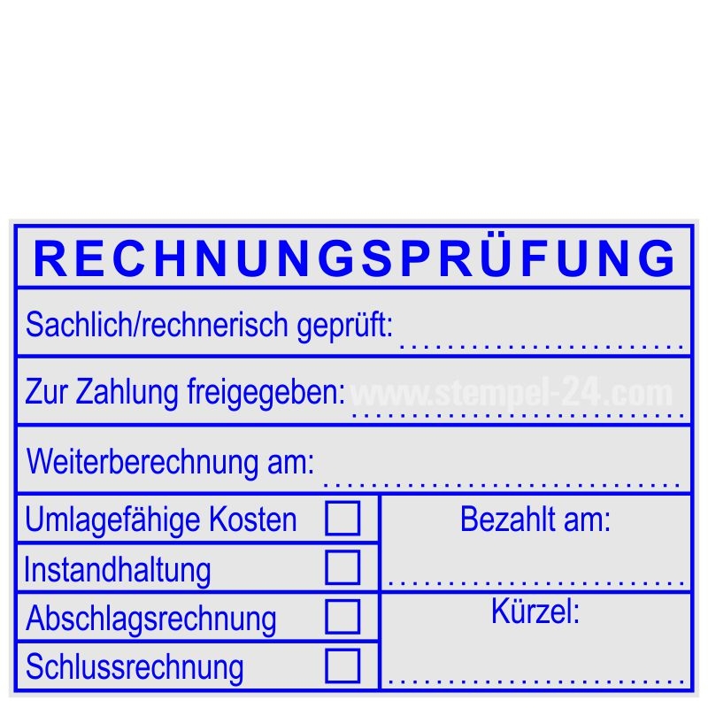 Textplatte: Rechnungsprüfung, Sachlich/rechnerisch geprüft, zur Zahlung freigegeben, Weiterberechnung an, Umlagefähige Kosten, Instandhaltung, Abschlagsrechnung, Schlussrechnung, Bezahlt am, Kürzel.- Abdruckgröße 67 x 46 mm