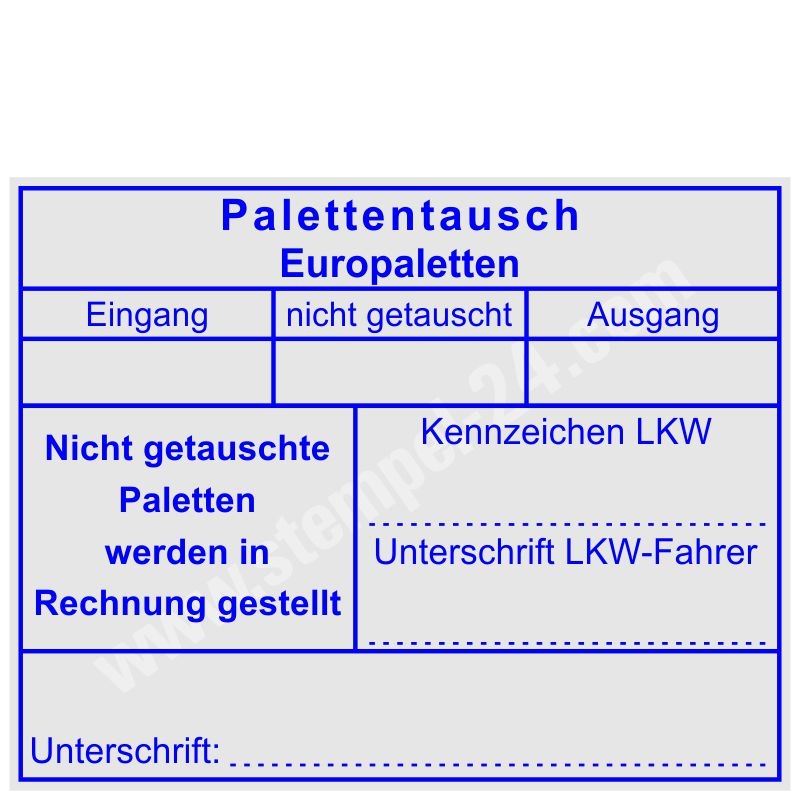 Textplatte: Palettentausch Europaletten, Eingang, nicht getauscht, Ausgang, Nicht getauschte Paletten werden in Rechnung gestellt, Kennzeichen LKW, Unterschrift LKW-Fahrer, Unterschrift.