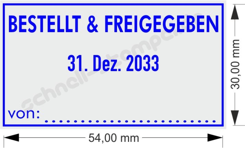 Textplatte: BESTELLT UND FREIGEGEBEN, (Datum verstellbar) von, Unterschrift.