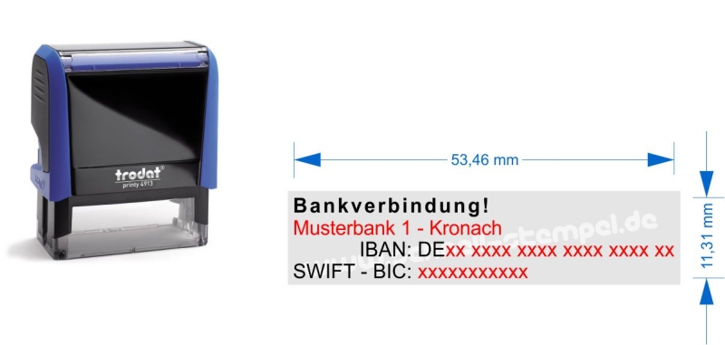 Texte werden individuell geändert! In Ihrer Bestellung können Sie die Bankdaten für den Roten Text in der Bestellung in ein Kommentarfeld eingeben und wir gestalten die Angaben ein. Oder Sie möchten Ihre fertige Datei mit Text im Anschluss der Bestellung hochladen. Beides bearbeiten wir gerne. Bevor die Stempelplatte gefertigt wird, erhalten Sie von uns einen Korrekturabzug zur Prüfung. Nach Erteilung der Freigabe wird der Stempel hergestellt.